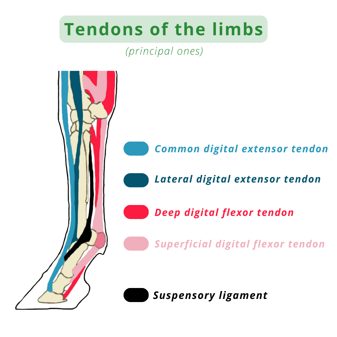 Tendons consist of solid, smooth fibres that connect muscles to bones, facilitating joint movement by transferring the force of the horse's muscles to the bones. Horses have four primary tendons in their limbs: two extensor tendons and two flexor tendons.