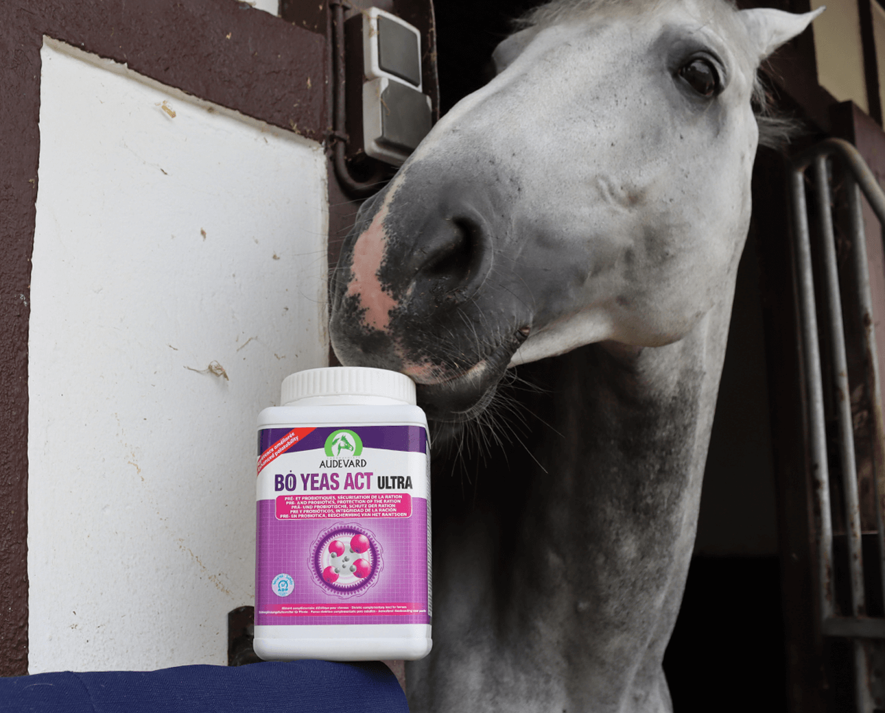 Bo Yeas Act Ultra helps to support physiological digestion in horses by providing pre- and probiotics for balanced digestion and MYCOSORB A+ Equine for feed security.