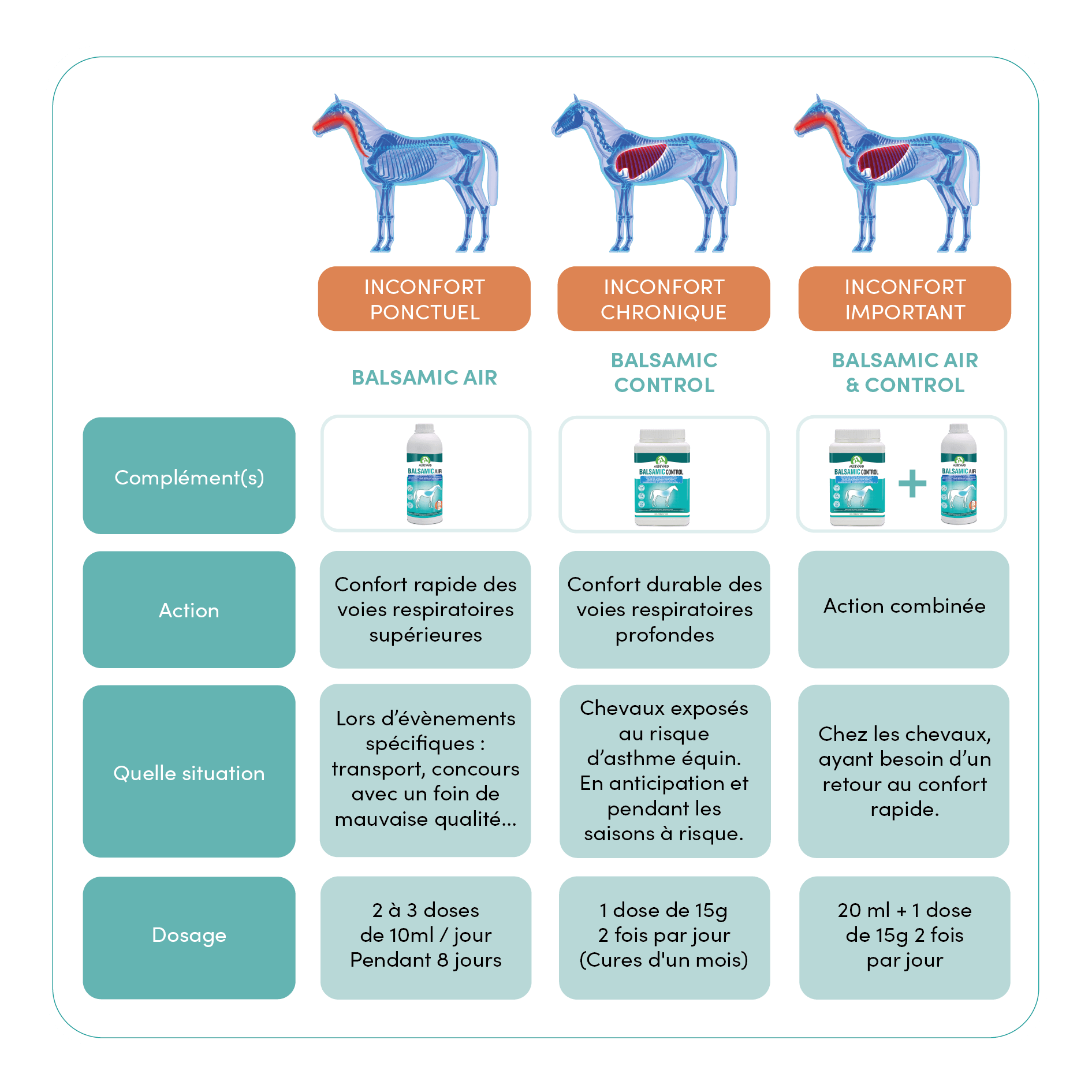 Balsamic Control est un complément alimentaire conçu pour l’appareil respiratoire de votre cheval. Il a été conçu pour apporter une aide nutritionnelle adaptée aux besoins pulmonaires de votre cheval, qu’il vive dans un environnement poussiéreux (pollens, moisissures...) ou qu'il soit un jeune cheval à l'entraînement.